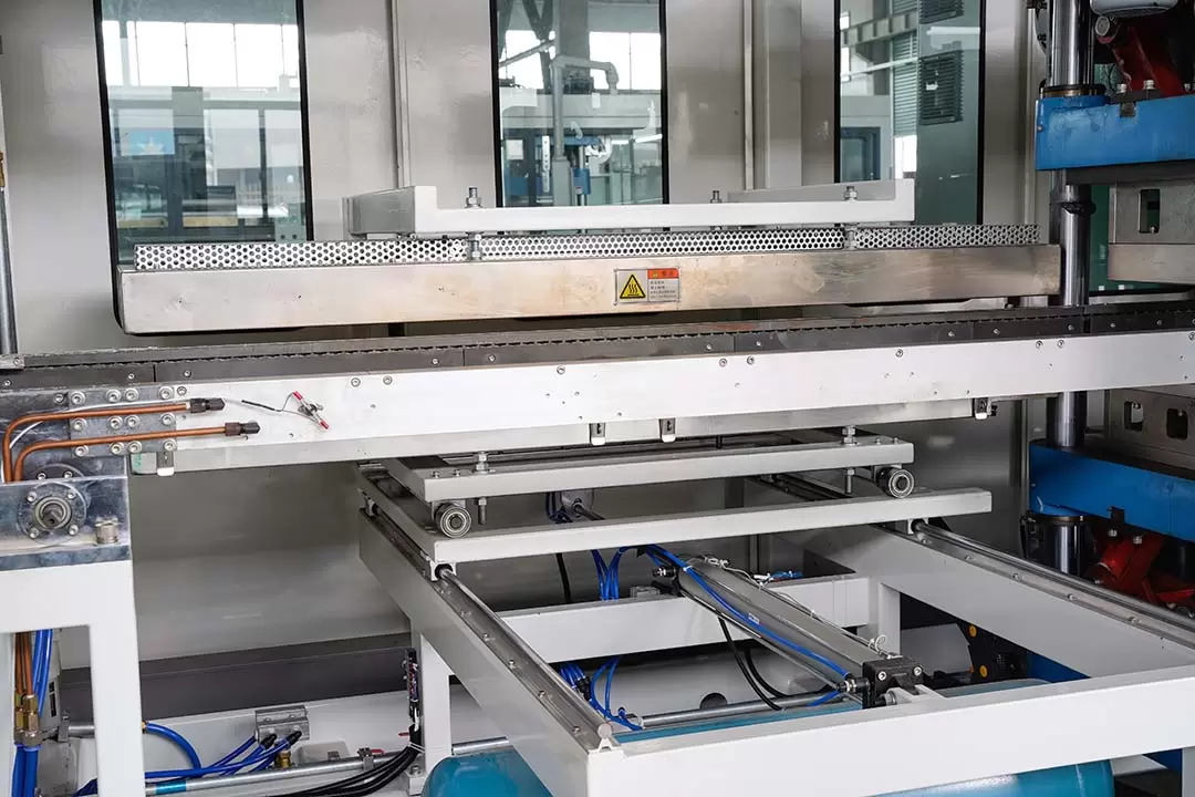 สถานีทำความร้อน: ระบบทำความร้อนที่มีประสิทธิภาพใช้เทคโนโลยีความร้อนอินฟราเรดเพื่อให้ความร้อนแผ่นพลาสติกสม่ำเสมอ ช่วยให้มั่นใจได้ว่าวัสดุได้รับความร้อนสม่ำเสมอเพื่อให้บรรลุอุณหภูมิการขึ้นรูปที่เหมาะสมที่สุด