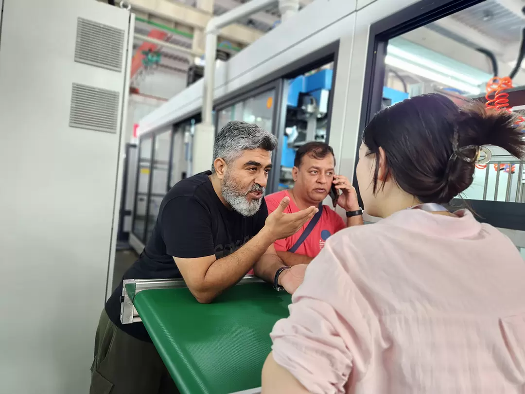 เมื่อวันที่ 21 สิงหาคม 2023 ลูกค้าชาวอินเดียของเรามาที่โรงงานเพื่อศึกษา เนื่องจากลูกค้ากังวลว่าจะยากต่อการขอวีซ่าของวิศวกรที่ว่าจ้างจากจีนไปอินเดีย ลูกค้าจึงริเริ่มมาที่โรงงานของเราเพื่อเรียนรู้ความรู้เกี่ยวกับอุปกรณ์เพื่อผลิตและจัดส่งโดยเร็วที่สุด เราขอขอบคุณลูกค้าสำหรับการสนับสนุนของเรา ด้วยความเข้าใจและการสนับสนุน ลูกค้าจึงซื้อเครื่องขึ้นรูปพลาสติกแบบสามสถานีอัตโนมัติ TTF-700A และแม่พิมพ์ 11 ชุดในบริษัทของเรา ซึ่งใช้ในการผลิตกล่องใส่อาหารแบบ 8 ช่องและกล่องใส่อาหารแบบ 3 ช่องจากวัสดุ PP และกล่องพลาสติกแบบฝาพับ PET ที่มีความลึกต่างกัน ส่วนใหญ่ใช้สำหรับบรรจุภัณฑ์สลัดผลไม้